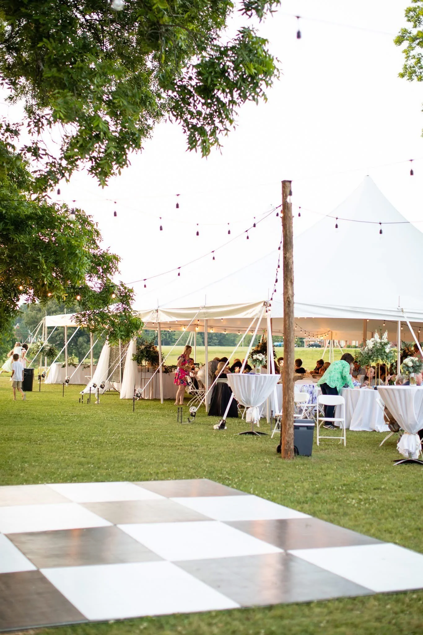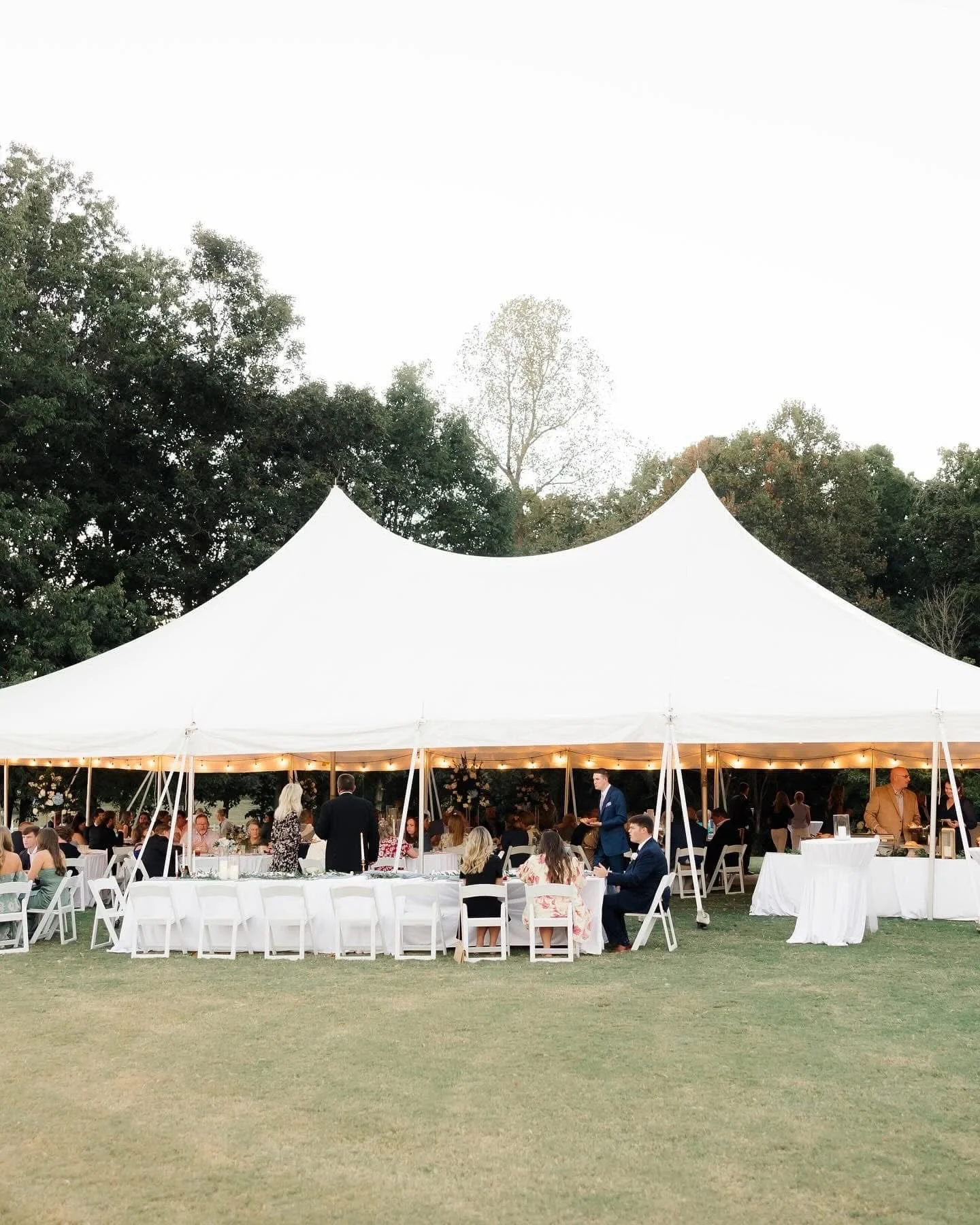 40x80 Tent: With 3,200 sq ft of space, this expansive tent comfortably hosts up to 256 guests, ideal for large weddings, corporate galas, or significant celebrations.