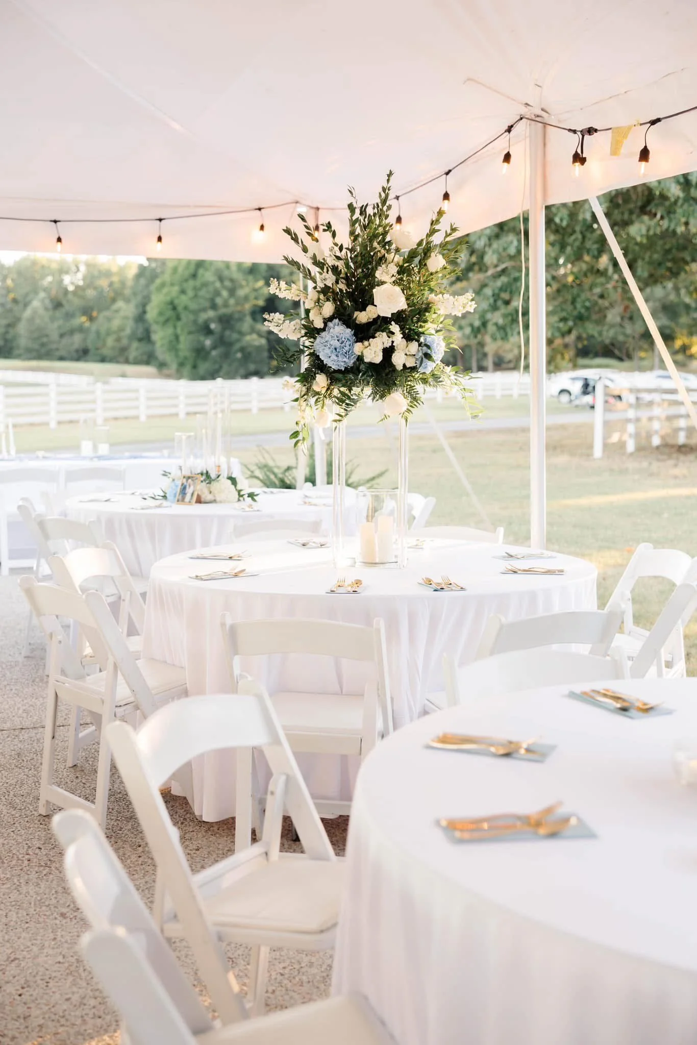 40x80 Tent: With 3,200 sq ft of space, this expansive tent comfortably hosts up to 256 guests, ideal for large weddings, corporate galas, or significant celebrations.